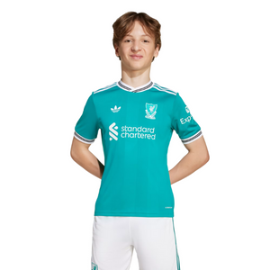A modern soccer classic inspired by Liverpool FC's storied 3-Stripes history. The tonal vertical stripes on this juniors' third jersey come in unmistakable adidas Equipment green. On the chest, that vintage club badge shares the spotlight with a Trefoil for the first time since 1991. Created for traveling Reds, this shirt includes moisture-managing AEROREADY so it feels as good as it looks.