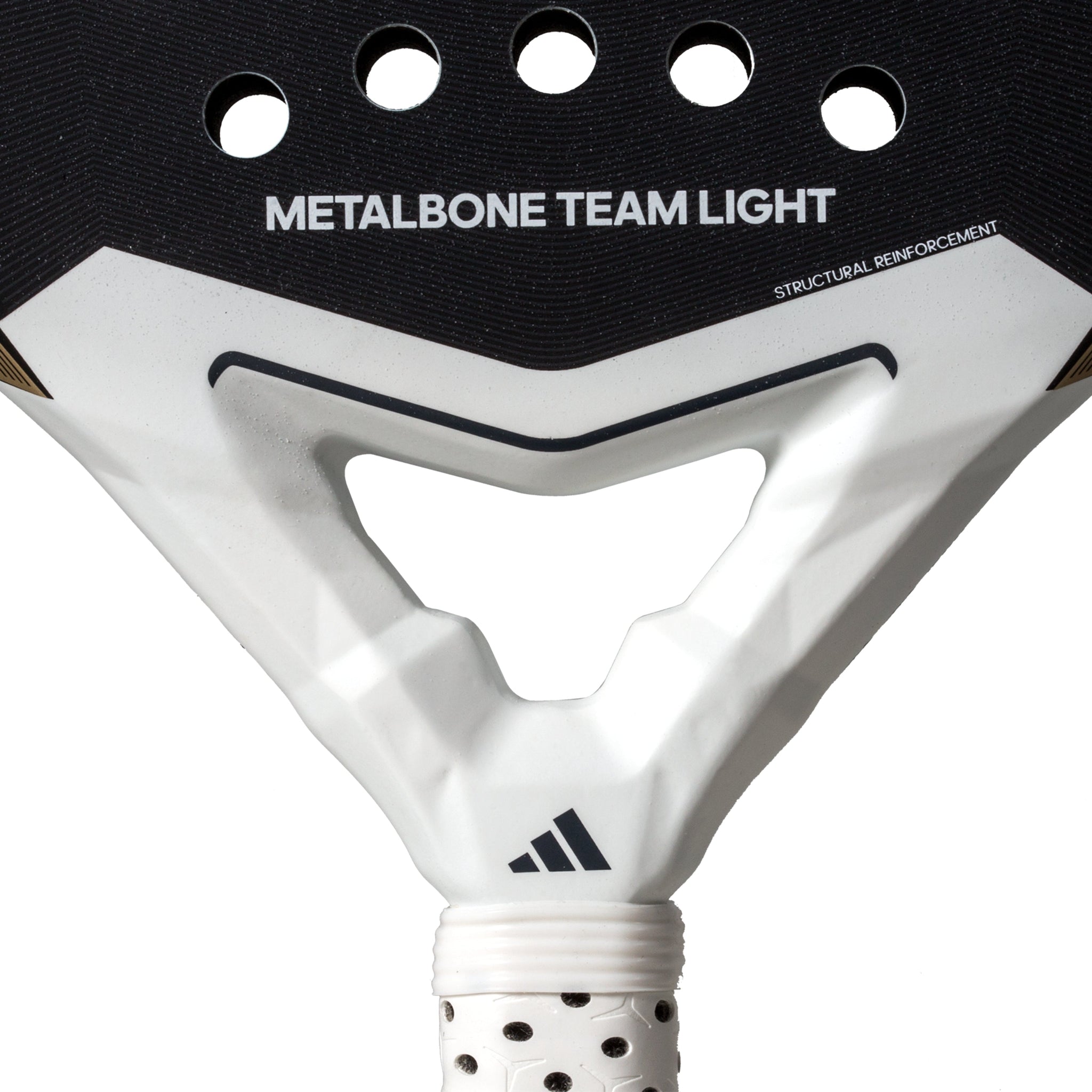This Metalbone Team Light has been made to offer the high-performance elements of themetalbone range in an extremely maneuverable, lightweight package. This includes the new technologies that further boost the precision and performance of this racket. This starts with a whole new redesigned frame with an integrated power groove that runs along the entire outer structure of the frame providing greater rigidity and higher ball output in your most powerful shots. This brings us to the improvement of the internal structures, with their low polypolyhedral design of the frame and core. With the team series, we have afiberglass hitting surface for a great feel off the ballcoupled with a good level of playability for those who play often and for longer periods. This face is laid over the Adidas soft performance EVA core. This low-density EVA rubber provides a great feel and comfort without sacrificing control. Through the face we have the Smart Holes Curve and Structural Reinforcement technologies further enhance the performance of this racket, ensuring it can withstand the demands of competitive play. This is then surrounded by the distinctive Metalbone octagonal structured frame that gives the racket its unique shape. This tubular structure is what gives the racket its great rigidity and amazing feel through all your shots.