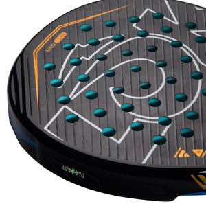 But this is just the start, in addition to all the above technology we have to mention, possibly the most unique feature in Padel to date, the Asymmetric heart. This is said to be theemblem of the LOK Padel Rackets. While the design is asymmetric there is still a perfect balance maintained throughout with the hallmark lateral steps from the heart to the face offering structural rigidity that provides stability and is key to achieving this optimal balance. Above the heart we have the dynamic holes system, which is a progressive arrangement of two different hole sizes in the central part of the face, to assist in increasing power delivery.On the face we also have theThe 3D spin lines system which helps increase the rotation of the ball when it hits the racket. It consists of a series of diagonal lines that are separated at an optimal distance of 7mm for an improved feel and overall increase in control.