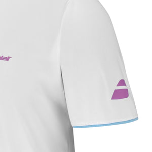 The Juan Lebron Crew Neck Tees in the whitecolour scheme also feature the all-important 360 motion technology, which is an intelligent fabric design that isoptimised for the most complex movements experienced in Padel. This is achieved by having no seams under the arms orin between the legs and a Bio-Technical that moves with the player. We also have the Fiber Dry technology that is associated with the use of this specific, 100% recycled polyester that Babolat calls a Fiber Dry-polyester. Chosen for this collection because it is so light and soft to the touch, easy to care for, as it allows for the most intense wear and tear from practice to competition, andlastly the moisture absorption and dissipation properties that we know are all important.