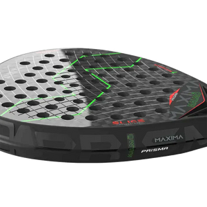 In addition this racket boasts a patented Prisma Frame made from 12K carbon fiber in a rhomboid shape and manufactured in a prism shape which has been tested in a wind tunnel and has resulted in a further 10% less wind resistance in comparison the a hexagon shaped frame. This allows for high speed through the ball and increased control. Additionally this frame technology means a reduction in the contact point of the frame against the walls and surfaces by 90% giving the racket better maneuverability through the Padel Ball.