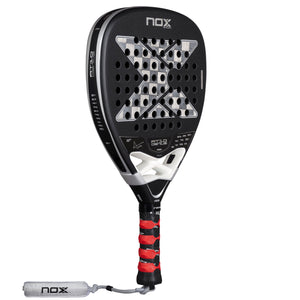 The carbon frame features the Dynamic Composite Structure, applying more material from the frame edge to four centimetres into the face, minimising hardness differences and reducing the risk of fibre breakage when hitting powerful shots. The Pulse System reduces vibrations with lateral rubbers running from the base of the frame to the bottom cap, whilst the Oversize Grip extends 30mm for players who prefer a longer handle for increased leverage and two-handed shots. The patented NOX Custom Grip technology, certified by Testea Padel, increases grip and reduces vibrations for supreme comfort during aggressive play. Below this, the Smartstrap system allows quick strap replacement without removing the bottom cap.